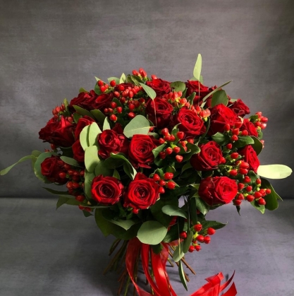 Стильная композиция с розами и гиперикумом "Страстный вечер" | Купить в Миконосе
